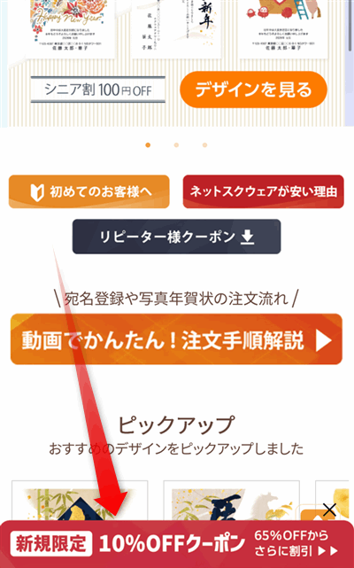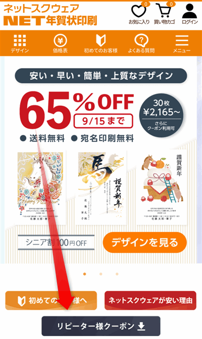 昨年「ネットスクウェア」へ注文した人がもらえるクーポンが「リピータークーポン」です。昨年に注文した人なら誰でも使えて、15%オフになります。
